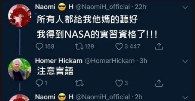 然而,娜歐蜜並未受到教訓,她再次以嗆辣的態度回應了希克曼。但這次,她碰到了「硬茬」,希克曼揭曉了自己也在NASA工作並擔任相關單位主席的事實。娜歐蜜立即意識到自己的得意之言十分不對,她刪除了文章並關閉了推特賬號。