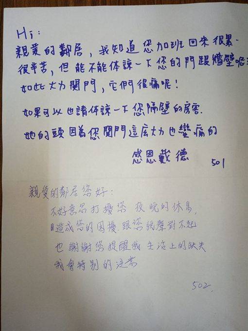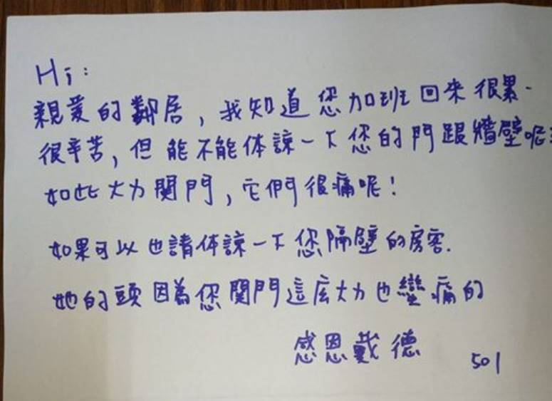 最近,一名女網友在社交媒體上分享了一個讓人感動的故事,引起了廣大網友的共鳴。這位女網友抱怨她住處隔壁的房客經常大聲關門,震動墻壁和地板,晚上還頻繁進出房間,影響了她的休息。為了解決這個問題,女網友決定用紙條婉轉地提醒鄰居他們的行為對她造成了困擾,并希望他們能注意輕一點關門。