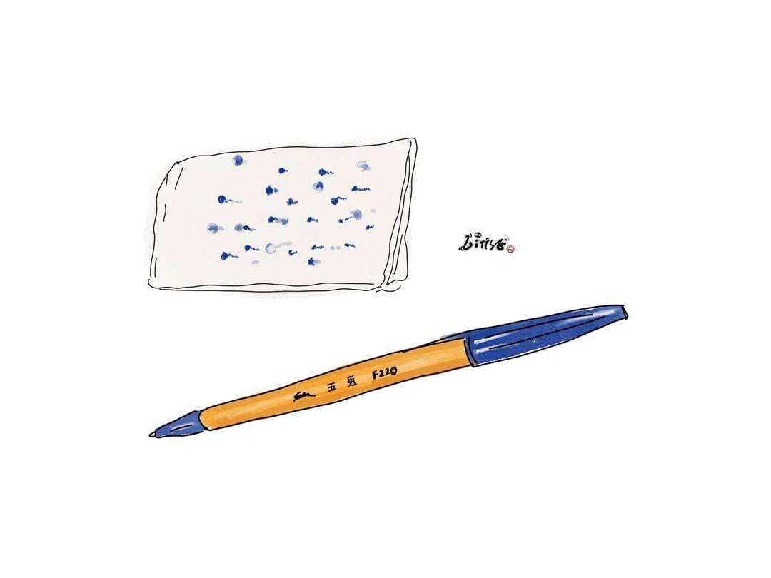 早期的玉兔原子筆必須要搭配衛生紙使用,因為寫一寫就會漏墨水啊~~每次寫到一半就要把筆尖點在衛生紙上吸除過多油墨,然後就會獲得一張充滿藍點點的衛生紙XD