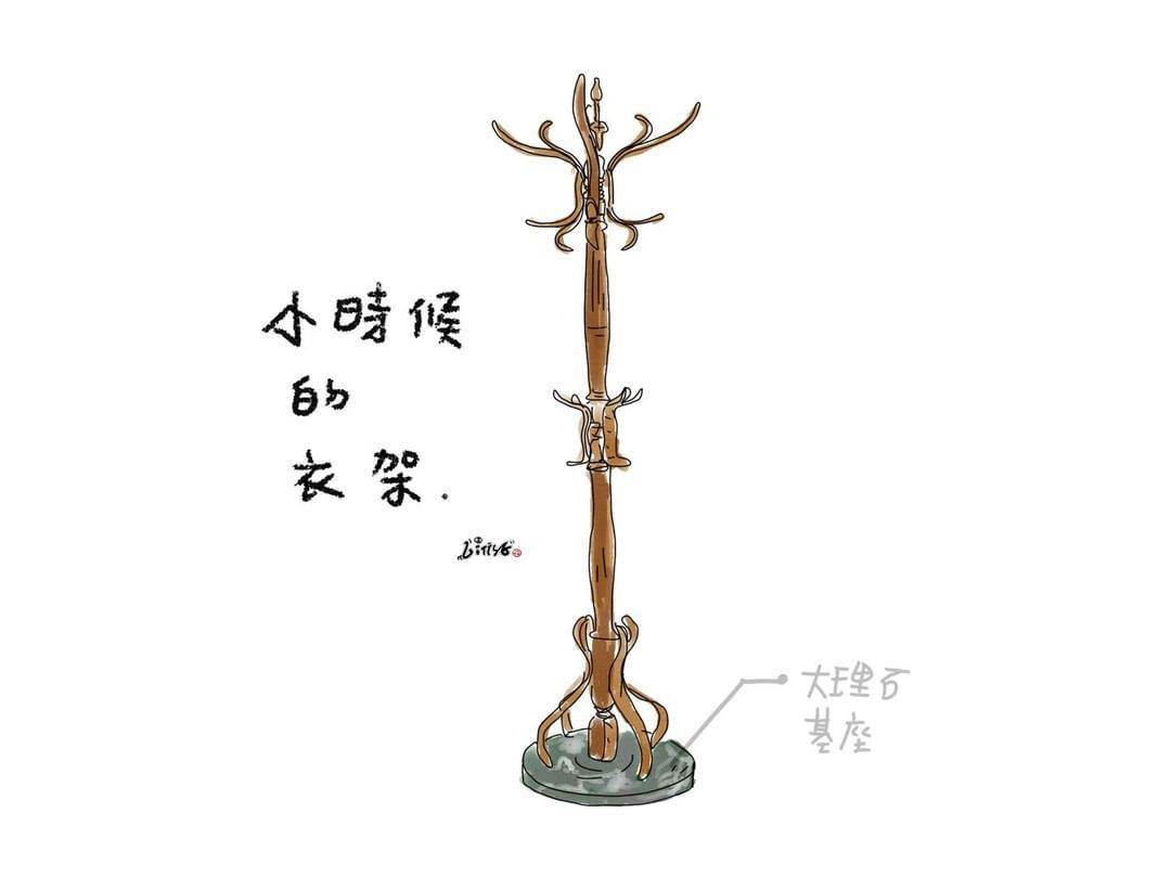 小時候家家戶戶都有的衣帽架,基座通常由重重的大理石製成,掛衣服的彎曲木條有對稱的曲線,不過現在好像大家都是把衣服堆在某張椅子上啦~