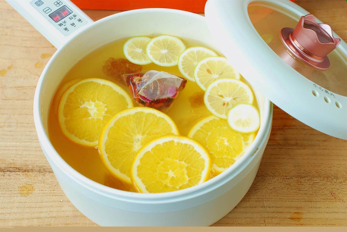 橙子切成片,放入鍋中,檸檬也切成薄片放進去,加入50克老冰糖,放入紅茶包,蓋上蓋子,小火燉煮5分鐘就好了。