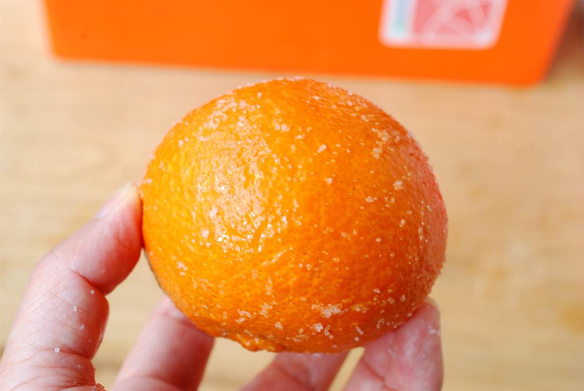 步驟二:或者用細鹽粒仔細搓洗一遍,再用清水沖洗干凈。這兩種方法都可以去除橙子皮中的農藥殘留和表皮的雜質。