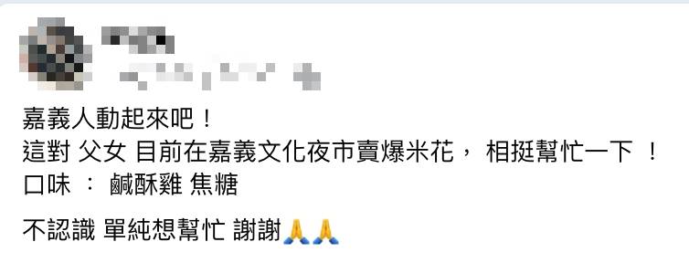 「嘉義人動起來吧!這對父女目前在嘉義文化夜市賣爆米花, 相挺幫忙一下!口味有鹹酥雞、焦糖。」