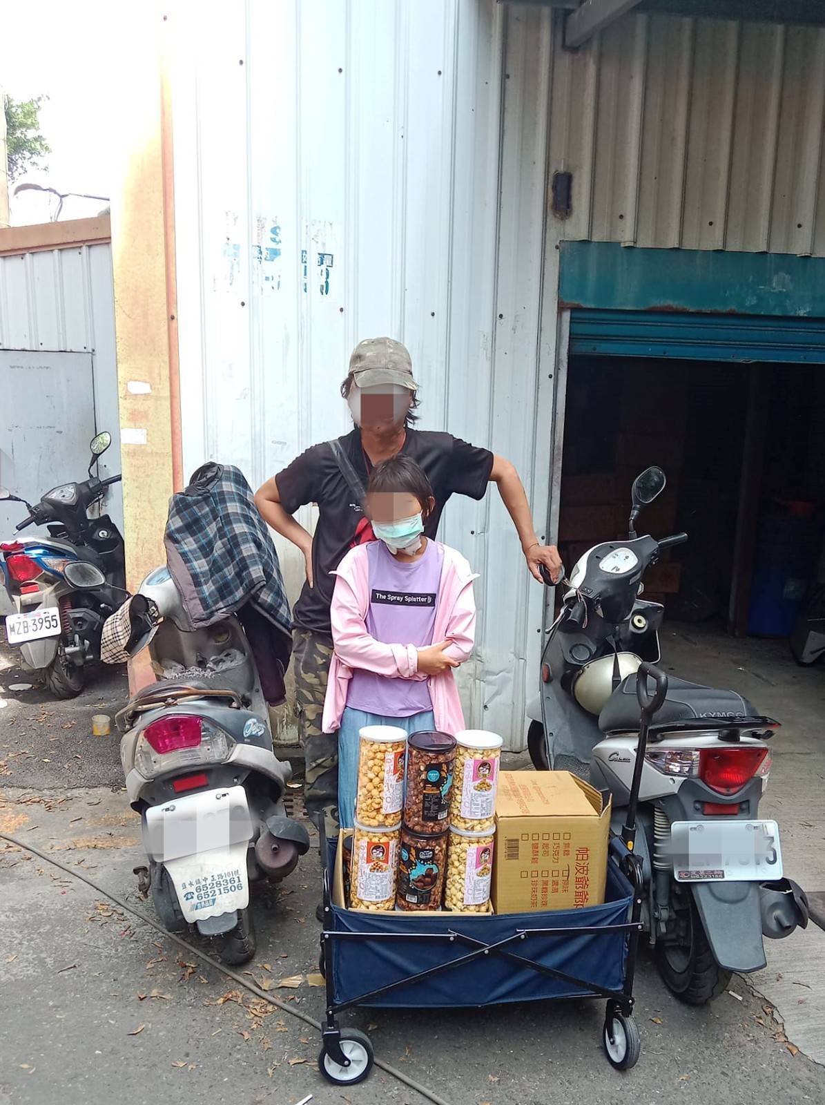 臉上疑似有不明腫塊,可能是化療留下痕跡,女兒則站在一旁,兩人拖著推車、上面擺滿了各種口味的爆米花。