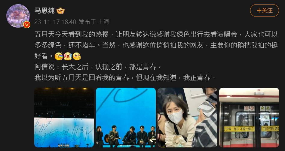 在網路上掀起一陣轟動後,馬思純隨後也PO文承認自己確實去看五月天在上海的演唱會時有搭捷運:「五月天今天看到我的熱搜,讓朋友轉達說感謝我綠色出行去看演唱會,大家也可以多多綠色,還不堵車,當然,也感謝這位悄悄拍我的網友,主要你的確把我拍的挺好看。」