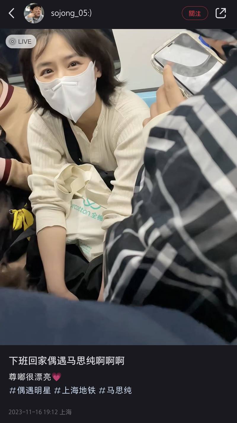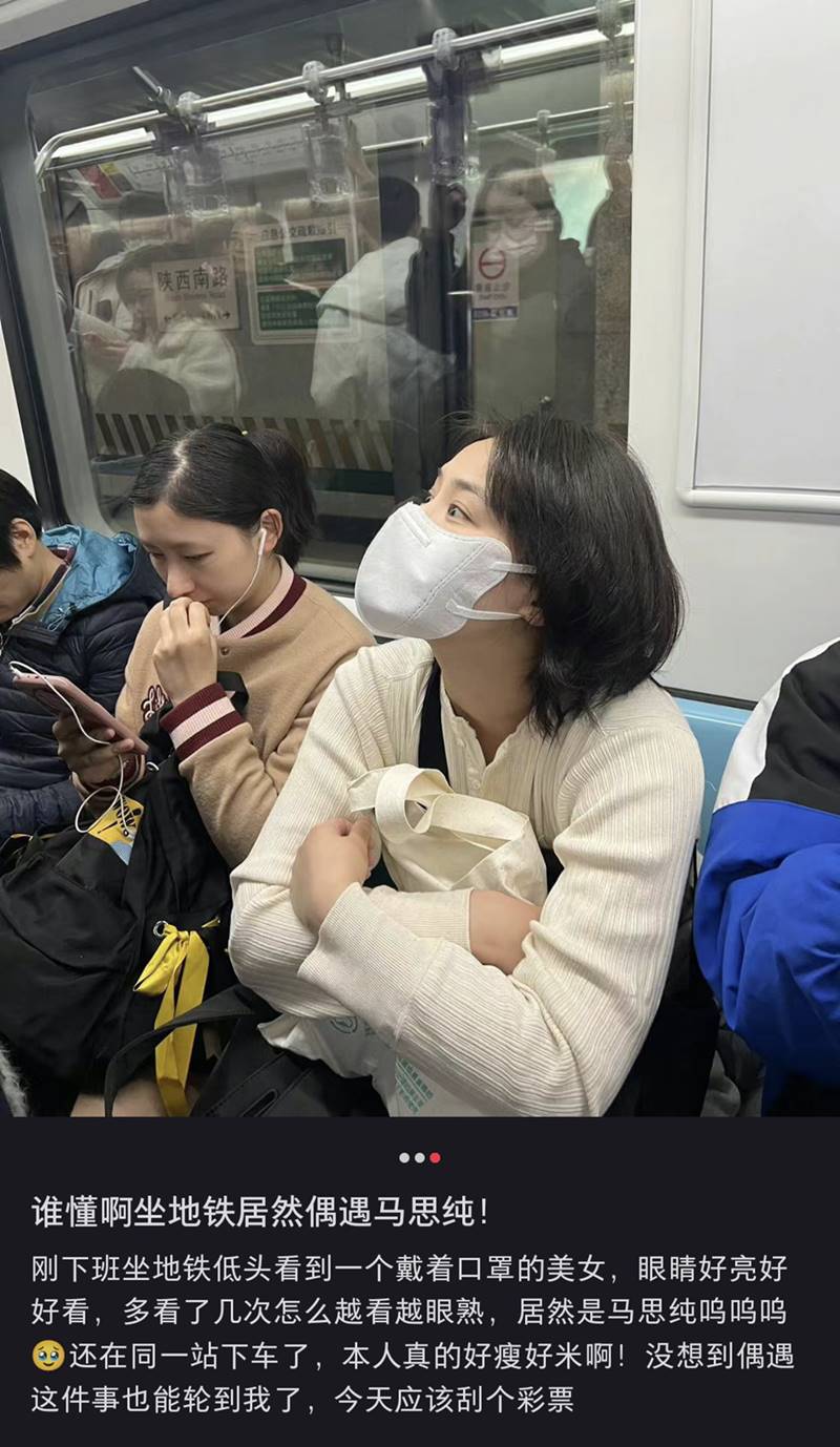 目擊網友表示下班搭捷運低頭看到一個戴著口罩的美女,越看越覺得這位正妹很眼熟,隨即認出同在捷運上的居然是大明星、興奮直呼:「下班回家偶遇馬思純啊啊啊~尊嘟(真的)很漂亮!」「眼睛好亮好好看,多看了幾次怎麼越看越眼熟,居然是馬思純嗚嗚~還在同一站下車了,本人真的好瘦好米(美)啊!沒想到偶遇這件事也能輪到我了,今天應該刮個彩票!」。