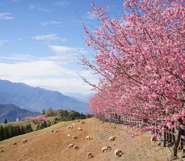 清境農場中擁有一條櫻花步道,可以從小瑞士花園沿著步道往青青草原方向走,這條步道在2月份櫻花盛開時是櫻花步道,等到秋季時又能欣賞楓紅美景,春秋美景各有千秋。此外,在青青草原上除了可以看見綿羊群外,沿著青青草原的四周現在也開滿了櫻花,從遠處或高處欣賞,美不勝收,運氣好的話還能與綿羊一起在櫻花樹下拍照,可愛又夢幻。