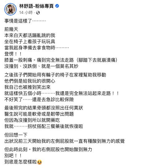 看到媽媽突然倒下,孩子們也暖心地推有輪的椅子幫忙,讓她能暫時以此代步,等待病痛自行消失。但離奇的是,即使休息超過5小時,患處仍異常疼痛,讓他們一家都非常擔心林舒語狀況,在丈夫幫忙下緊急送醫。醫師用X光檢查患部後,發現骨頭並無異狀,「可能是軟骨或是韌帶出問題」。當天,醫師為她開藥舒緩,並搭配柺杖代步,病痛也奇蹟似地痊癒了。