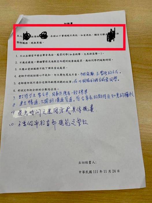 可以看到原PO貼出的切結書中,洋洋灑灑地寫出10點老師要遵守的規定...