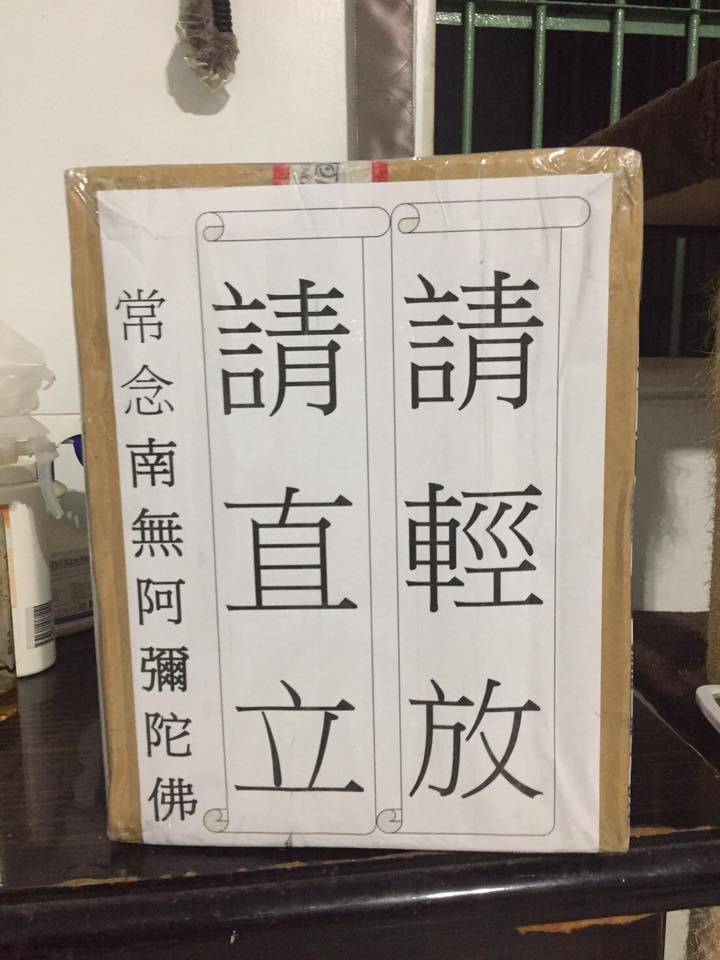 事實上,過去也有包裹因為特殊包裝而引起熱議~只見一位網友曬出了自己領到的包裹,包裹紙箱上4面都貼著白紙,上面寫著「請直立,請輕放」,邊邊還附上一句「常念南無阿彌陀佛」整個佛力滿滿!