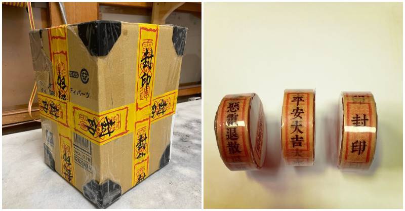 最近就有一位網友在臉書「爆廢公社公開版」貼出一張照片,只見他的包裹上貼滿了各種「符咒」造型的封條膠帶,上面以黃色底色為主的膠帶除了有寫著大大「封印」字樣,還用紅色筆跡畫出了宛如符咒的圖案,紙箱外各個角落都被貼滿滿,看起來似乎有些怪異。