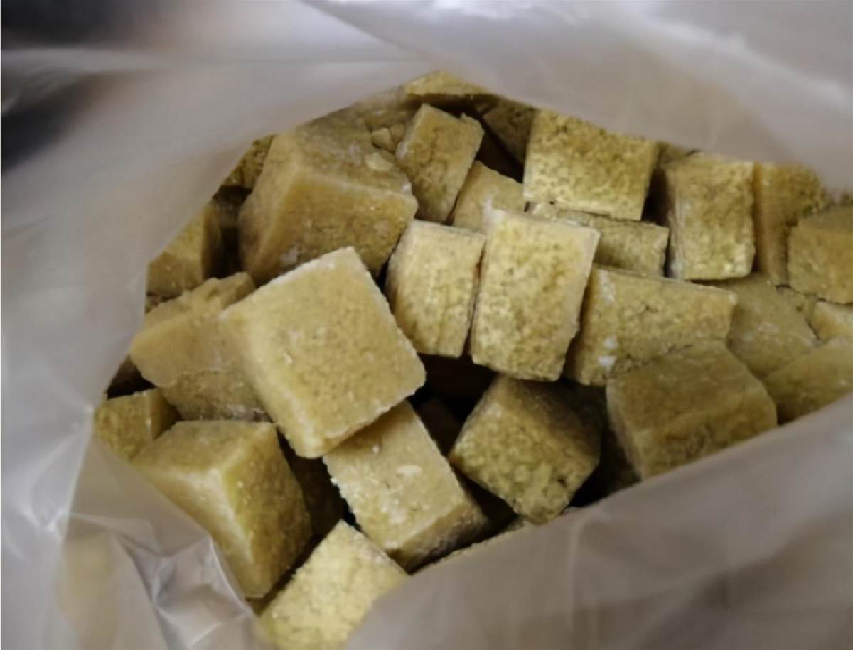 3、先將豆腐就這麼端進冰箱凍一天,等到第二天取出來之后,就能明顯地發現這豆腐已經發黃發硬了,而且蜂窩賊大,最后找來保鮮袋,將豆腐塊倒進袋中,塞進冰箱冷凍保存就好了,隨吃隨取太方便,不得不說自家做的凍豆腐還真是衛生,比外面買的好,吃得更放心。