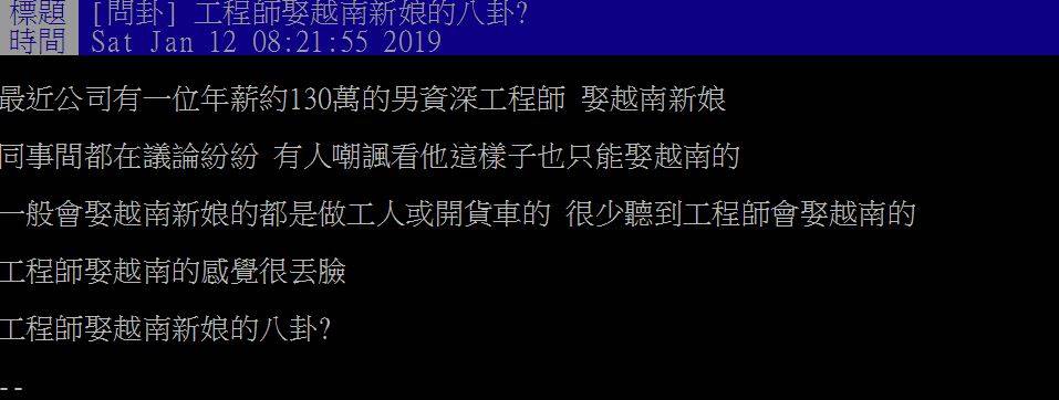 一名網友在批踢踢PO文,「最近公司有一位年薪約130萬的男資深工程師娶越南新娘,同事間都在議論紛紛。」表示一般會娶越南新娘的都是做工人或開貨車的,很少聽到工程師會娶越南新娘,讓原PO忍不住發問「工程師娶越南的感覺很丟臉?有沒有工程師娶越南新娘的八卦?」