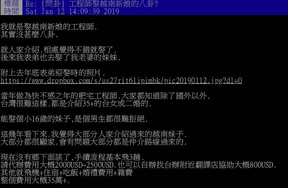沒想到不久就有一位專業網友迴文,表示自己就是娶越南新娘的工程師,
