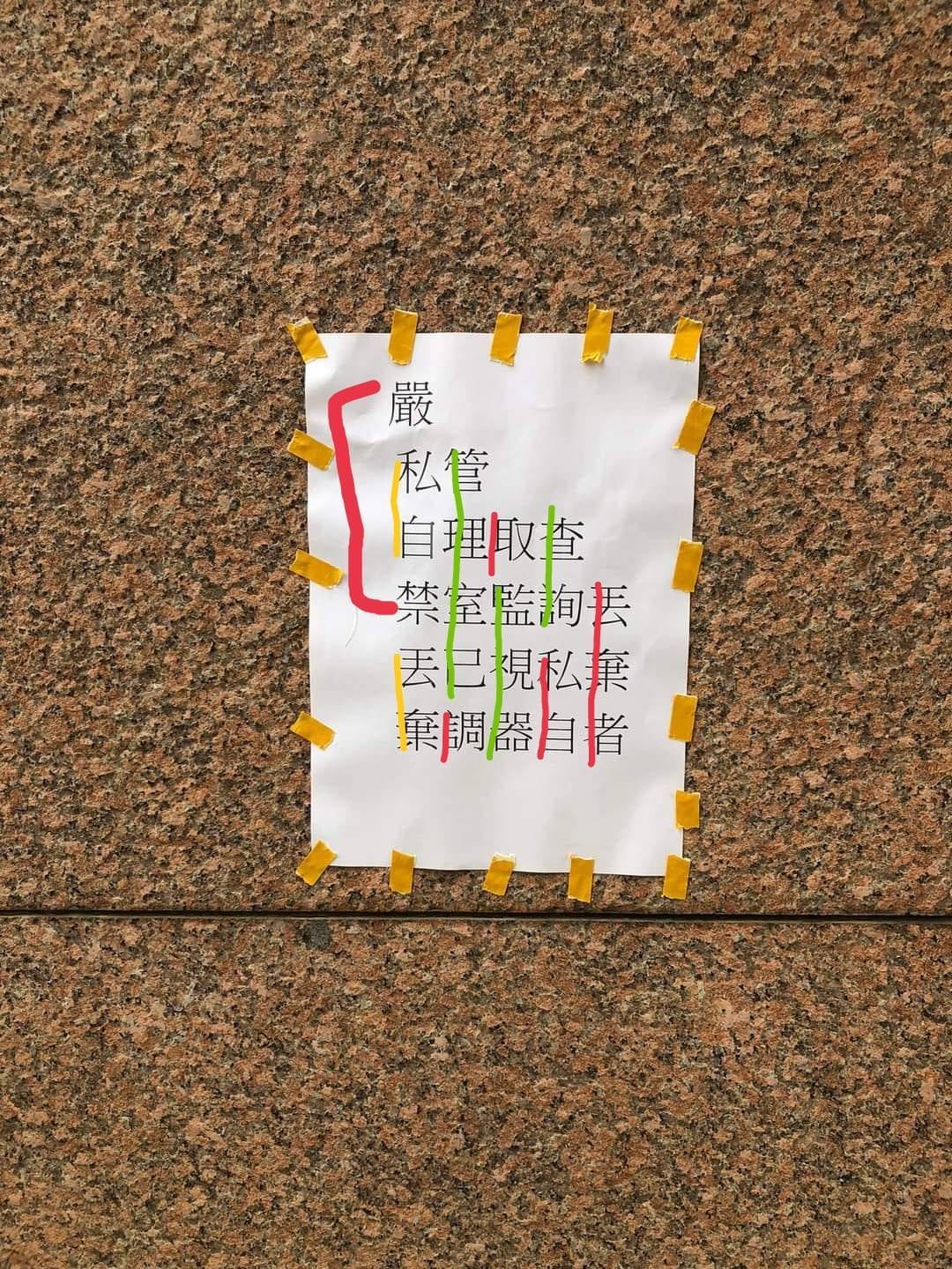 有網友仔細看了之後,才研究出這張公告要由左往右、由上往下的直式閱讀:「嚴禁私自丟棄,管理室已調取監視器,查詢私自丟棄者」,不過一般來說直式閱讀是由右往左,再加上公告還有缺字跳字,因此看起來超煩躁!還有網友指出膠帶的貼法也超獵奇XD「要打就好好打啦!要貼就好好貼啦!煩躁欸」、「誰跟你說雙面膠是這樣貼的?」