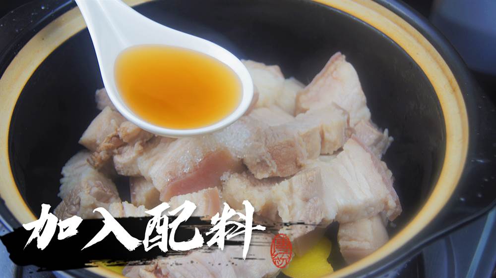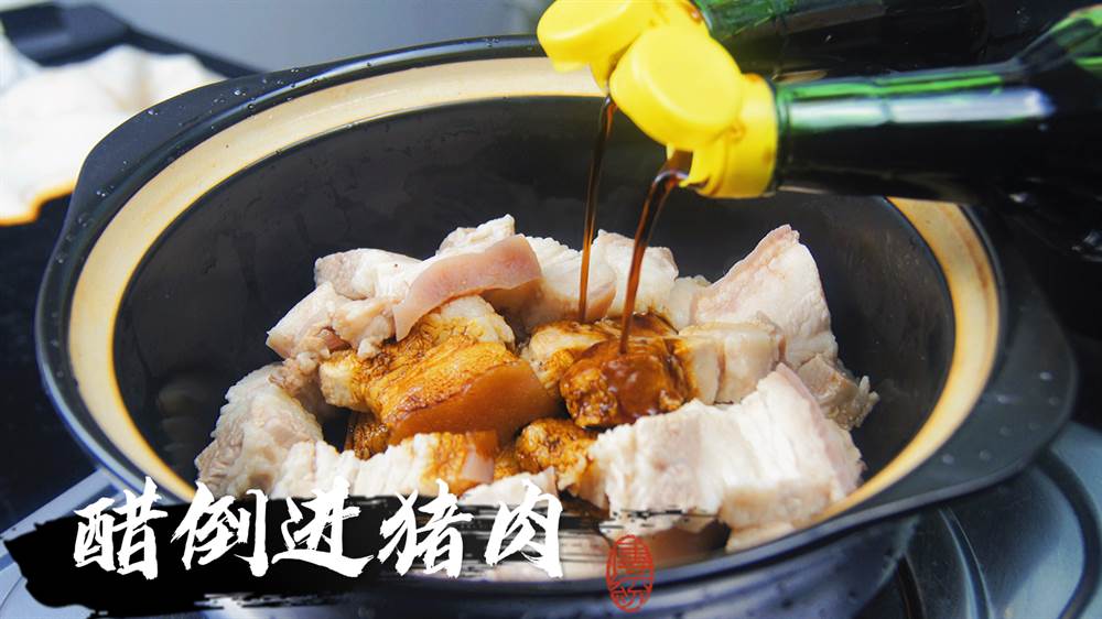 撈出煮好的豬肉,放入35度的溫水中清洗掉剩余的浮沫。接著準備一個砂鍋,在砂鍋底部鋪幾片生姜片,生姜片盡量不要疊在一起,放幾段大蔥后下入豬肉蓋住這些。豬肉鋪滿后,加入兩勺白砂糖,再來兩勺料酒,兩勺生抽調味。最后加入今天的主角,兩瓶香醋,剩下的兩瓶香醋!這個劑量正好蓋住豬肉,豬肉在香醋作用下,會變得很軟爛。