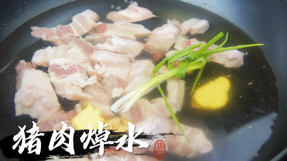 改刀將豬肉切成小塊,方便后面焯水。準備幾片生姜、一個蔥圈,燒開熱水下入豬肉塊,放入生姜片和蔥圈,蓋上蓋子燜煮即可。還可以放入料酒燜煮,讓豬肉待會煮出來更加的軟爛。期間打開蓋子,檢查有沒有浮沫飄出,用鏟子舀出鍋里面的浮沫,這些浮沫是腥味的來源。