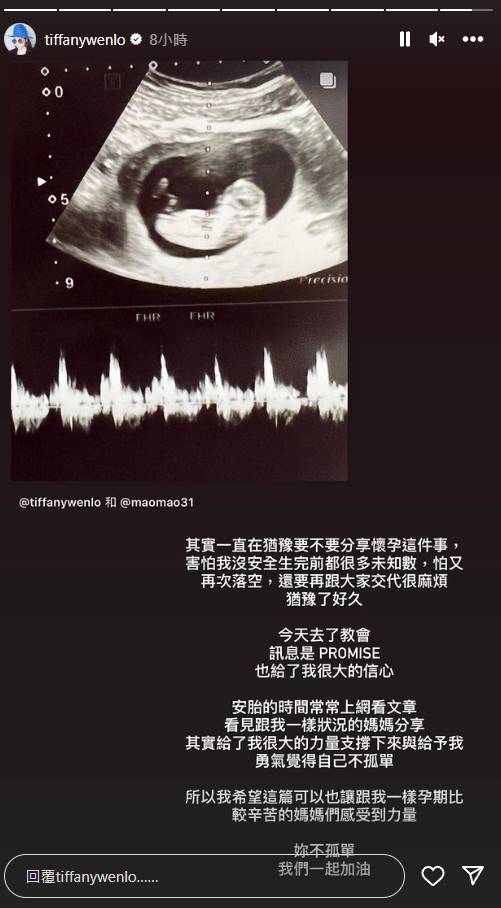 雖然在艱難的壓力下,一直覺得自己很難再有下一個孩子,不過在家人的支持,還有信仰的幫助下,羅雯也願意再嘗試看看,後來經過醫生的治療跟調養,自己居然奇蹟似地,又懷孕了,照過超音波後,目前都還算健康,不過還是要面臨出血等不穩定因素,還是要躺在床上安胎,雖然有過艱難懷第一胎、第二胎沒能抱住的經歷,但她還是樂觀看待,希望孩子可以平安出生。