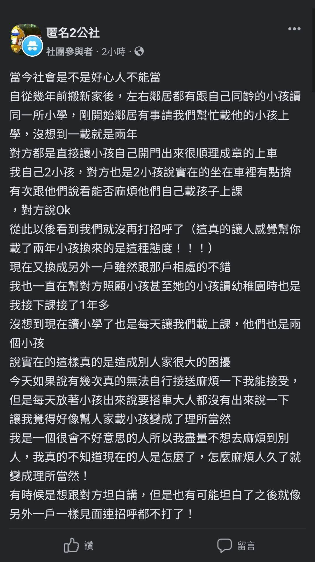 幾年前,這位網友搬家時發現左右鄰居也都是有小孩的家庭,他們的孩子們年齡相仿,就讀同一所學校,因此開始逐漸熟悉起來。有一次,A鄰居因為有事情求助原PO幫忙載孩子上學,當時原PO覺得沒有什麼問題,于是長達兩年的接送便開始了,對方甚至讓小孩自己開門上車。但是,由于車內太過擁擠,原PO向鄰居提出希望他們能夠自己接送孩子。