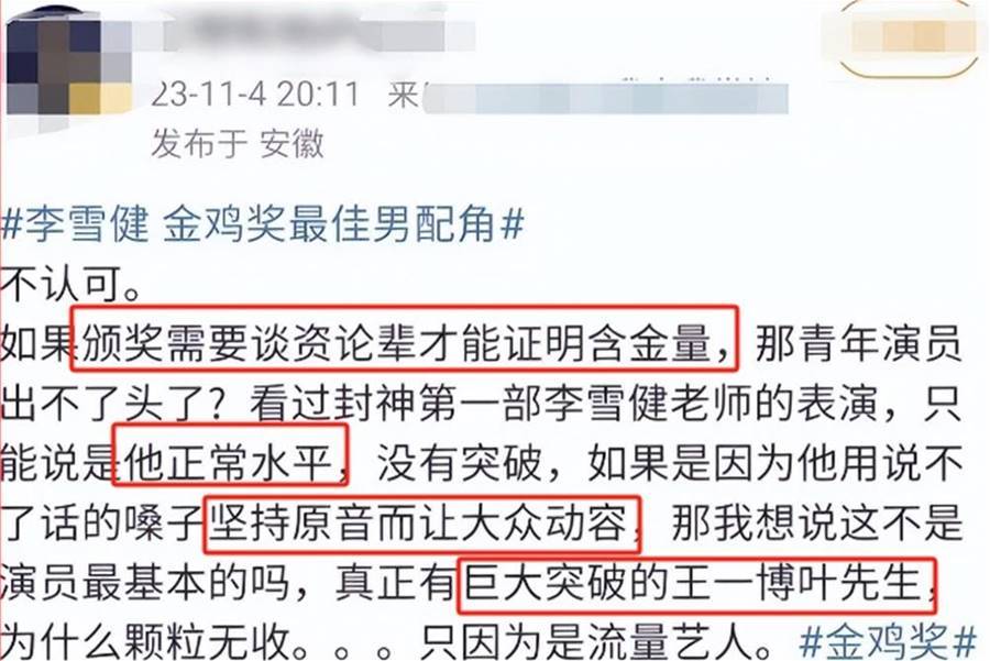 「李雪健老師的表演只算得上是正常水平,并沒有突破,反而是王一博飾演的葉先生才是巨大突破」