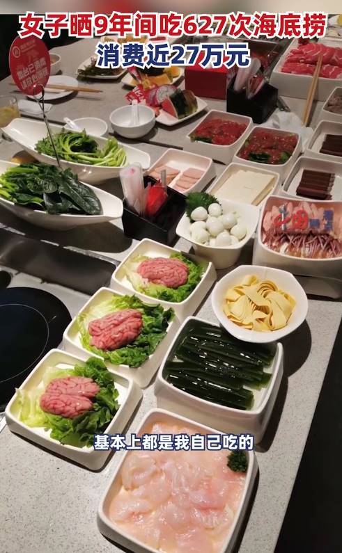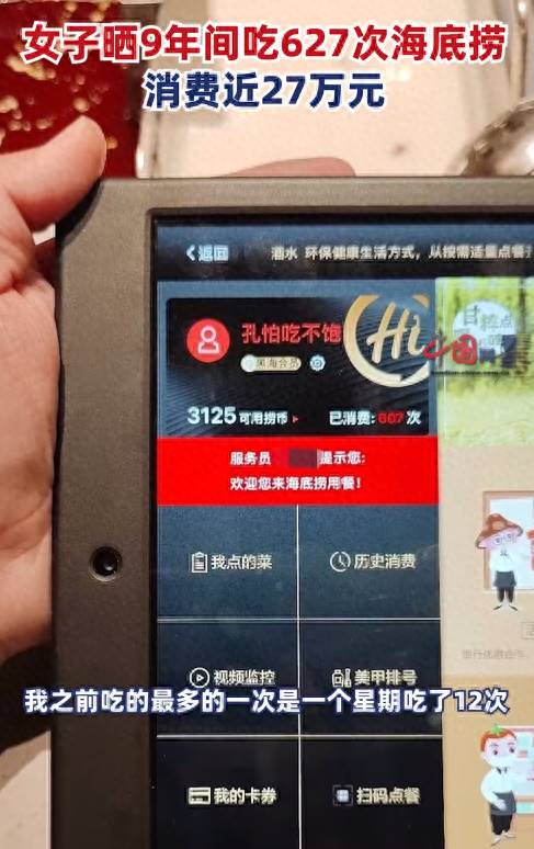 孔女士表示627次都是自己消費的,因為實在太喜歡海底撈,所以平常公司或家庭聚餐都會安排大家一起去海底撈用餐,自己也幾乎每個禮拜都會去吃,最高紀錄曾經1個星期連吃12次,甚至還有過除了早餐,午餐和晚餐都是吃海底撈的經驗!