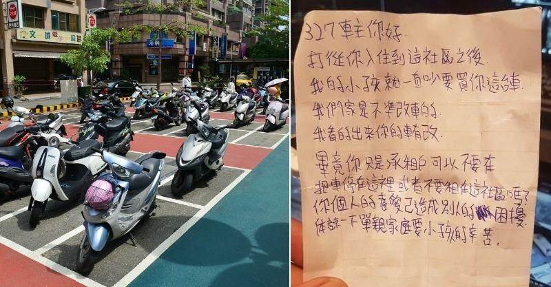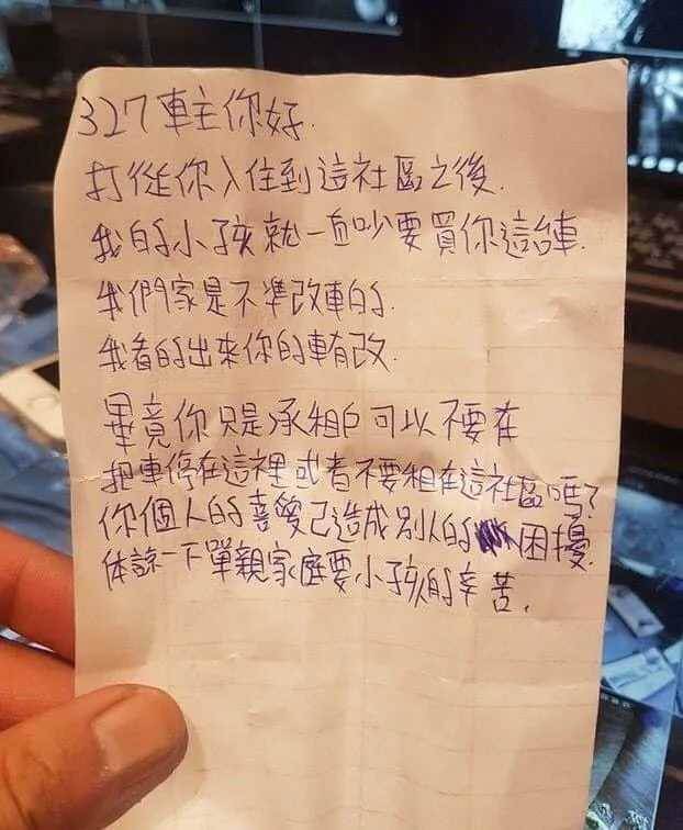日前有一名女網友在臉書社團「爆廢公社二館」上表示,朋友近期租了一間新的住處,因此也理所當然的把車停在住處社區內,不料卻因為「車子改太帥」而被疑似家長的人貼紙條提醒,還獅子大開口請他不要停在社區停車場!