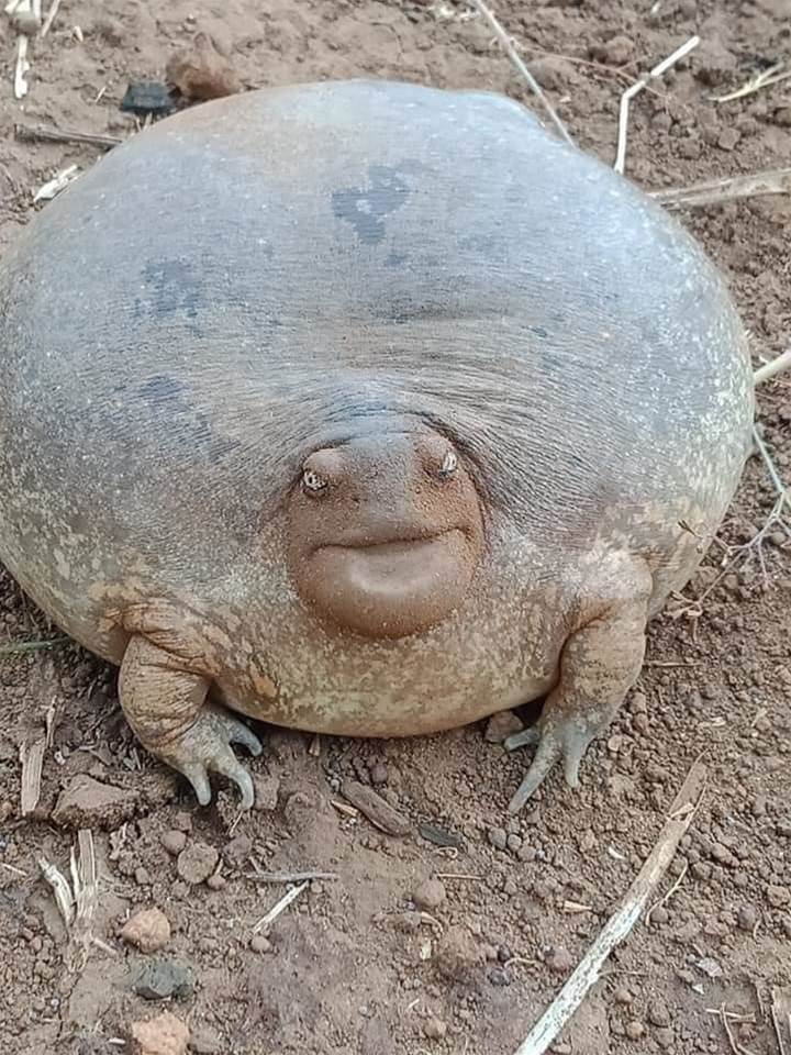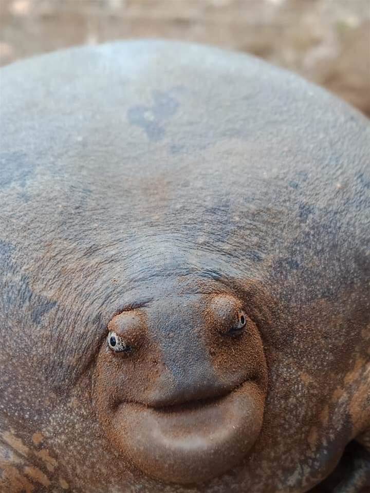 只見牠頭臉像烏龜(雖然脖子消失),但是身上不但沒有殼、還圓滾滾的像顆球,四肢又有點像青蛙...