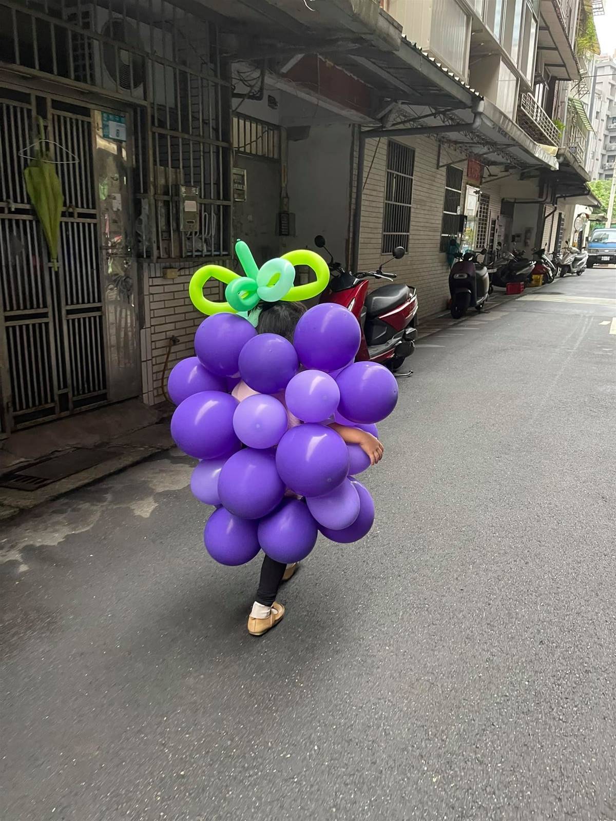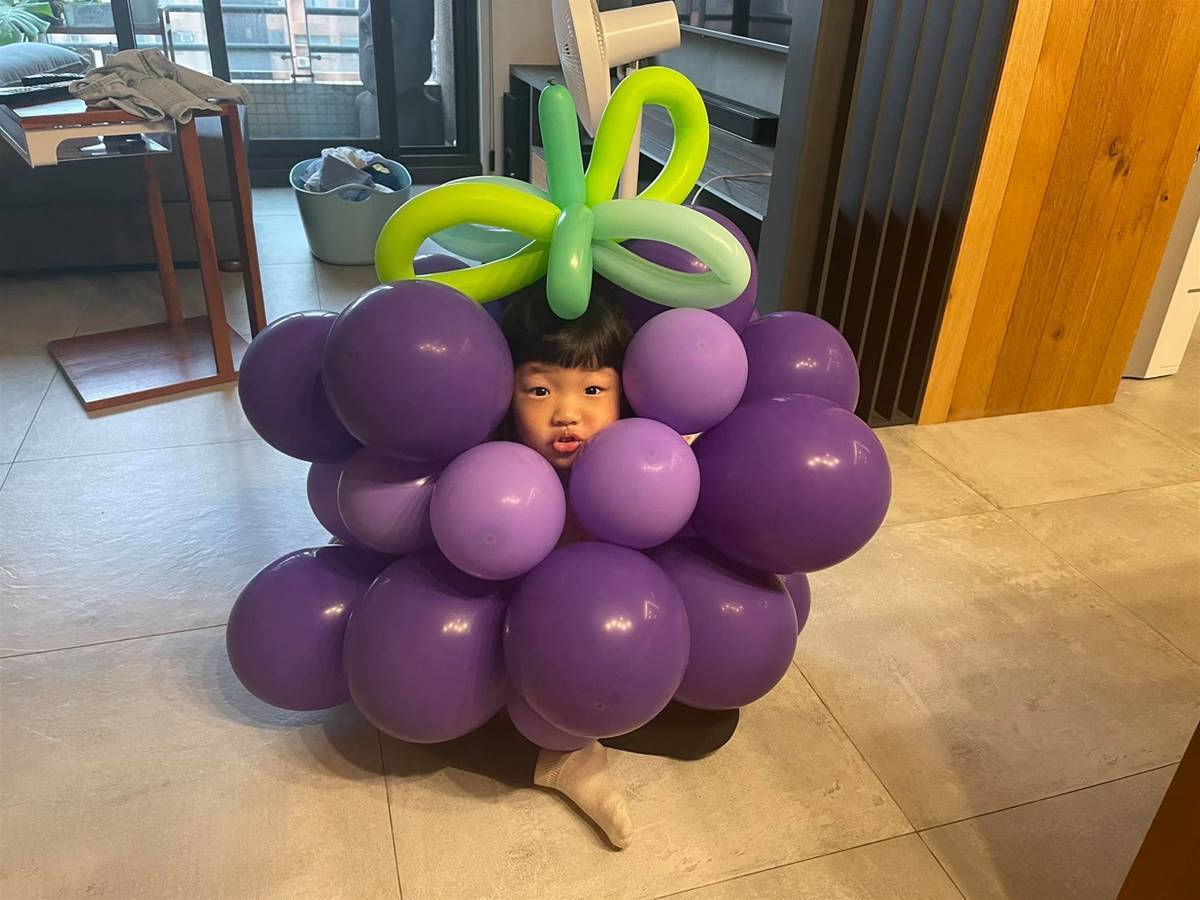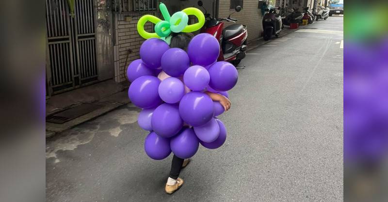 但更讓他無言的是,老婆竟然也同意了女兒的想法,開始把一顆又一顆的紫色氣球黏在女兒的身上,最後變身出超逼真又可愛的葡萄氣球裝,讓他忍不住在貼文中感嘆:「我怎麼告訴別人我女兒扮葡萄.