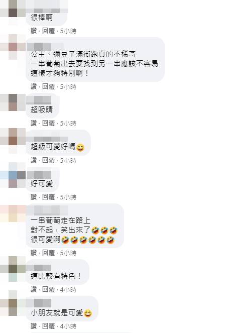 而貼文曝光後,立刻逗樂了一票網友,許多人都大讚女兒的葡萄裝真的超級Q萌,「她是全世界最可愛的葡萄」、「可愛開心最重要,跟別人一樣就不好玩了」、「很可愛欸!媽媽很有才喔!」、「超可愛欸!一直扮公主也很沒有變化好嗎」、「葡萄好可愛呀!這樣才有創意」、「好可愛喔,也好勇敢不怕氣球破掉」。