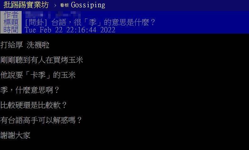 根據《聯合報》報導,有網友在論壇「PTT」上發文,忍不住好奇詢問「台語很季的意思是什麼?」原來他剛剛在買烤玉米時,聽到其他顧客熟門熟路對老闆點餐,要求要「卡季」的玉米,讓他聽了感到驚奇
