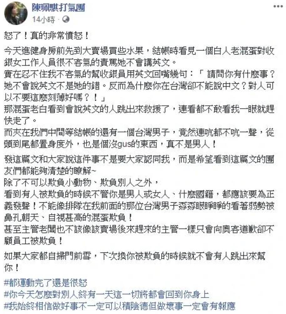 陳珮騏先前在臉書上分享了她到大賣場買水果的經歷,排在她前面的是一名白人顧客,竟然對著收銀員極不友善地指責,聲音大得讓人難以忍受。仔細一聽,才發現對方竟然是因為「店員不會說英文」而大發雷霆,讓收銀員完全無所適從。