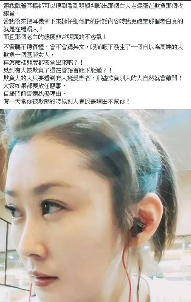 最後,她表達了她的期望,希望大家在看到有人被.欺.壓.的時候,無論男女,都不分國籍,都要挺身而出,為正義發聲:「不能像排隊在我前面的那位台灣男子,眼睜睜的看著弱勢被鼻孔朝天、自視甚高的混蛋欺負!」