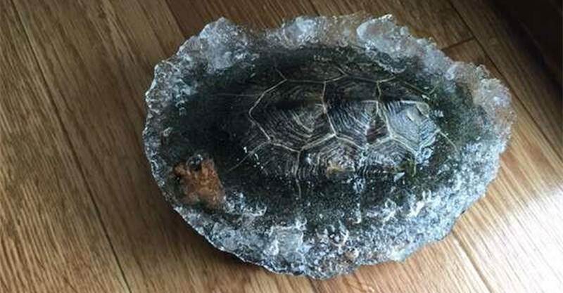 一位日本網友將家中烏龜的照片PO上網以後引起大家熱烈的討論,他前一日讓家中的烏龜到陽台上去散步,結果忘記將牠收進屋內,沒想到,經過一夜酷寒後,家中的烏龜竟變成這一整個冰塊。心急的他,立刻上網詢問有經驗的人,有沒有辦法可以將牠救回來。