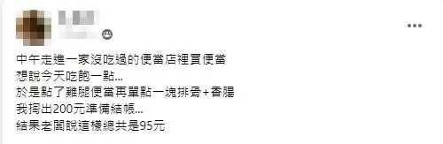 根據ETtoday報導,最近有網友在臉書「爆廢公社」表示,19日中午走進一間這吃過的便當店買午餐時,原本想說吃飽一點,就在點了雞腿便當之後,又另外加點一塊排骨和香腸,等于整個便當裡面有3樣主菜和3樣配菜,但令人感到意外的是,「我掏出200元準備結賬,結果老闆說這樣總共是95元。」