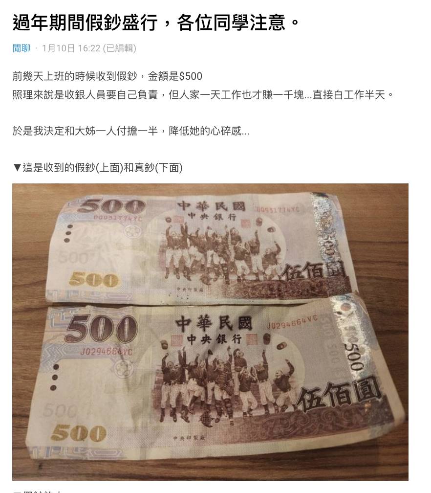 有名網友以「過年期間假鈔盛行,各位同學注意」為題在Dcard上發文,前幾天在上班時收到500元假鈔,照理來說是收銀人員要負責,不過體諒對方一天才賺1000多元,所以決定自己與另外一位資深的員工一起平分,降低收銀人員的損失。
