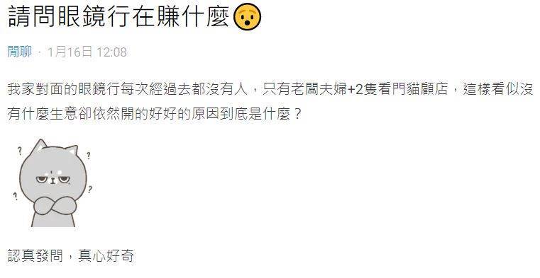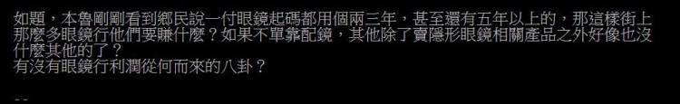Dcard也有網友以「請問眼鏡行在賺什麼?」為題發文表示,每次經過自己家附近的眼鏡行都發現裡面沒有人,「這樣看似沒有什麼生意,卻依然開的好好的原因到底是什麼?」