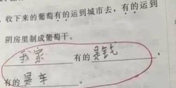 那次作業本來是挺正常的一個題目,要求小學生仿照例句中加點字造句。我們以前都是老老實實的「照葫蘆畫瓢」,但小明(這個名字是編的哈,以保護當事人隱私)顯然是個不走尋常路的小朋友。他似乎想展示一下自家的家底,直接寫下:「家里有的是錢和車。」哎呀,這一下可不是嚇到了老師,還引起了大家的圍觀。