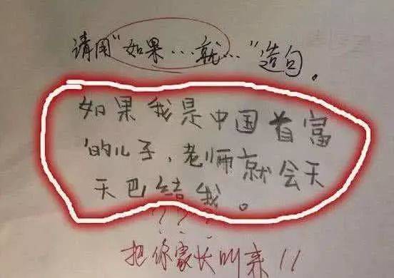 更有甚者,另一個「如果……就……」造句中寫道:「如果我是中國首富的兒子,老師就會天天巴結我」。哈哈,這讓人不禁想,這同學家里是不是真的很有錢呢?或者,這是在天馬行空的幻想?