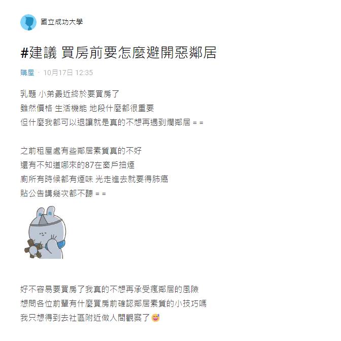 據《TVBS》報導,近日有網友在Dcard上表示,自己過去租屋時,常常遇到惡鄰居,還有人會在窗戶旁邊抽菸,導致廁所常常有煙味,貼公告也沒用,不勝其擾,最近原PO要買房了,他透露,雖然價格、生活機能、地段等都很重要,但比起這些他最不希望遇到爛鄰居,所以詢問各位網友:「各位前輩有什麼買房前確認鄰居素質的小技巧嗎?」