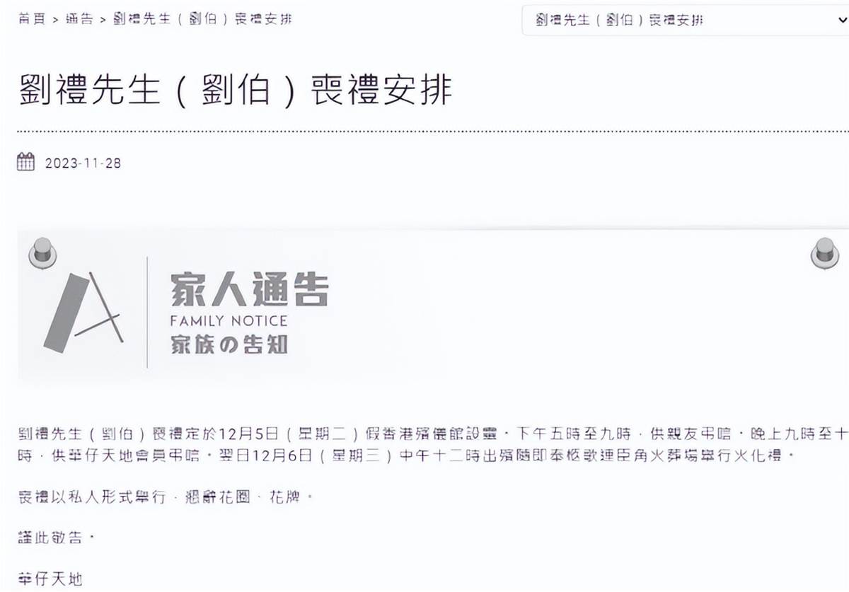28日,華仔天地官網發布劉德華父親喪禮安排,定于12月5日香港殯儀館設靈,下午五時至九時,供親友吊唁。12月6日中午十二時出殯舉行火化禮,喪禮將以私人形式舉行。此前,劉德華在華仔天地官網公開了父親劉禮于11月20日離世的消息,「親愛的家人:父親于20號在家人的陪伴中安詳離開了,感恩!華仔。」