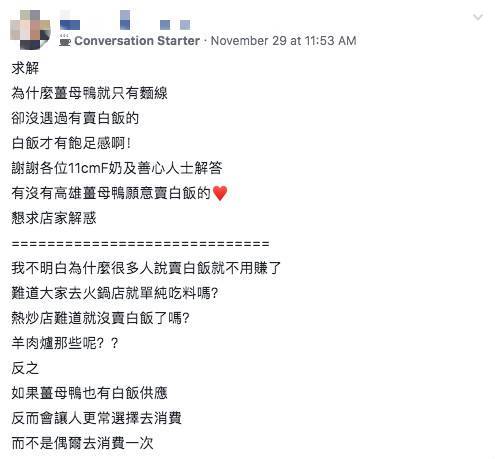 根據《TVBS新聞網》報導,這位網友在臉書「爆系知識家」發文,表示每次去吃薑母鴨時,都發現店家在主食的部分只會賣「麵線」,從來都沒有遇過有賣飯的,讓愛吃米飯、且認為這樣更有飽足感的他,覺得非常困擾,直到日前終于忍不住了,乾脆上網詢問,希望能夠釣出專業老饕替他解惑,「如果薑母鴨也有白飯供應,應該會讓人更常選擇去消費,而不是偶爾去一次吧」。
