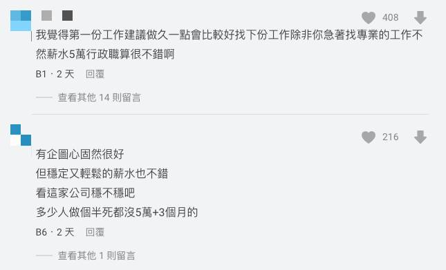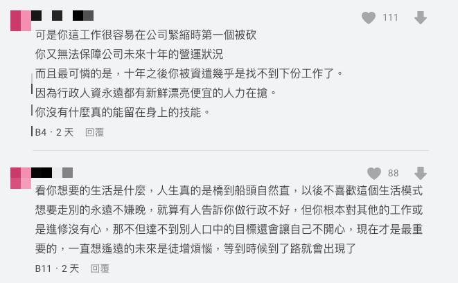 文章曝光後,有部分網友建議她堅持下去,並表示目前的狀態若能讓自己感到滿足,應持之以恆,「我覺得第一份工作建議做久一點,會比較好找下份工作,除非你急著找專業的工作,不然薪水5萬行政職算很不錯啊」、「有企圖心固然很好,但穩定又輕鬆的薪水也不錯,看這家公司穩不穩吧,多少人做個半死都沒5萬+3個月的」、「建議可以利用下班之餘或假日去培養其他的興趣、專業技能,以及外語能力,多去探索自己,挖掘其他的可能性」。