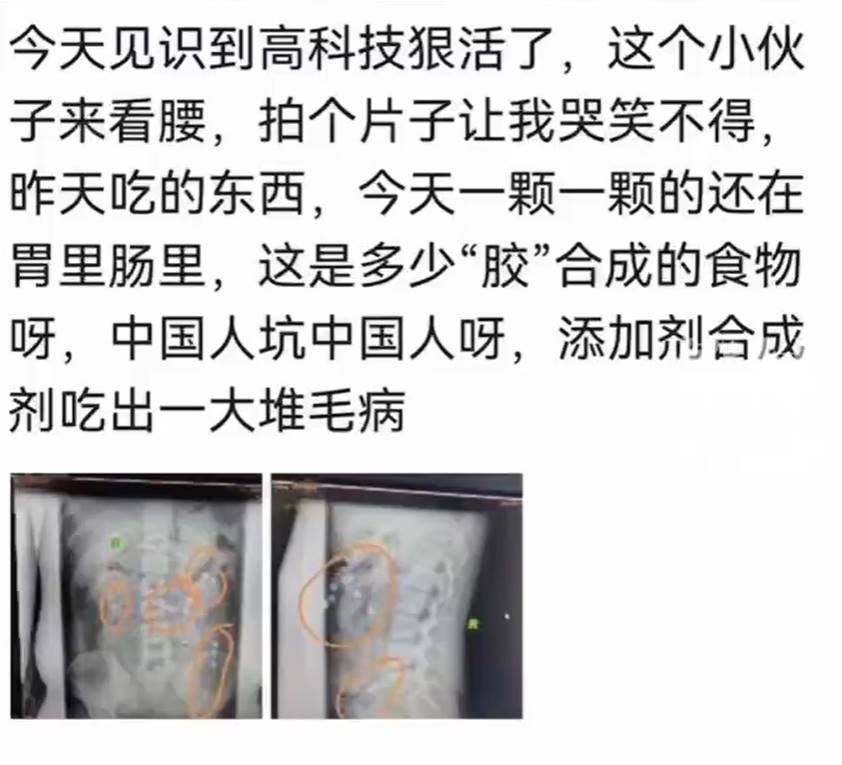 隨後,醫生更是在個人社交賬號上發文稱,「今天見識到高科技狠活了,這個年輕人子來看腰,拍個片子讓我哭笑不得,昨天吃的東西,今天一顆一顆的還在腸胃裡,這是多少『膠』合成的食物呀,添加劑、合成劑吃出一大堆毛病。」