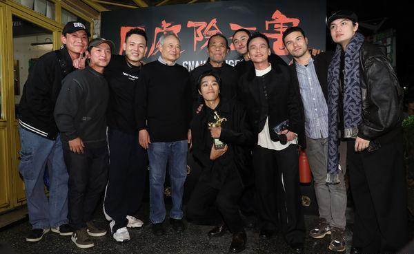 金馬執委會主席李屏賓與評審團主席李安出席《周處除三害》慶功宴,左起黃鐙輝、蔡昌憲、春風、李安、洪昰顥(中蹲者)、李屏賓、阮經天、陳以文、鳳小岳、劉子銓。(圖/記者李毓康攝)