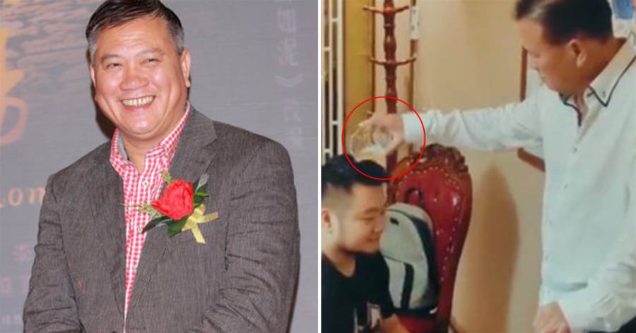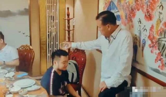 緊接著這位男子下跪行禮,萬梓良大聲呵斥讓他抬頭,隨即把杯子里的酒往男生頭頂上淋,邊淋邊說:「一生富貴,跟著我,鐵了心,你還有很多師伯師叔!」