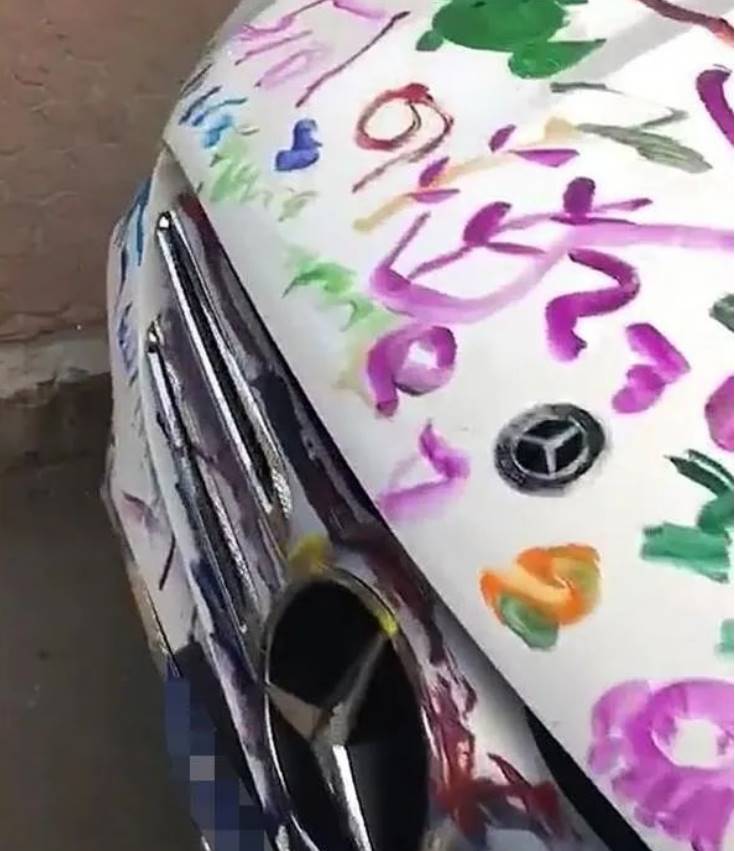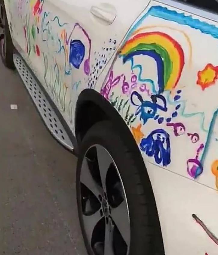故事是這樣的,車主,我們就叫他李先生吧,平時工作就在一個幼兒園附近。因為家里有個小公主上幼兒園,所以李先生習慣性地把車停在幼兒園旁邊,方便下班后接兒子回家。可是,有一天下班后,李先生走到車旁,差點眼前一黑,他的寶貝奔馳變成了一個「色彩藝術展」,簡直讓人傻眼了!