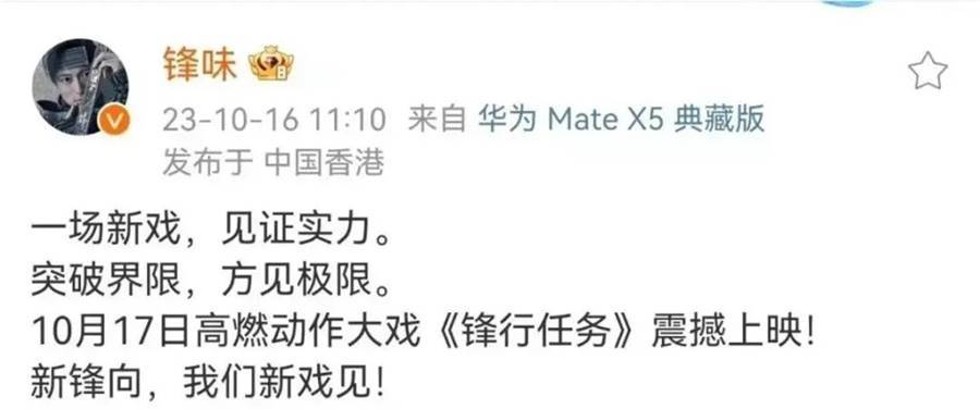 在他的官宣中我們看到他為華為Mate X5拍攝了一則名為《鋒行任務》的廣告,與其說這是個廣告片,不如說他是個精簡版的動作電影微電影。這個廣告充滿了動作大片的質感,謝霆鋒展現出了以往在《新警察故事》動作片中呈現的風格和氣質,一套行云流水般的打斗場面也讓人直呼過癮。