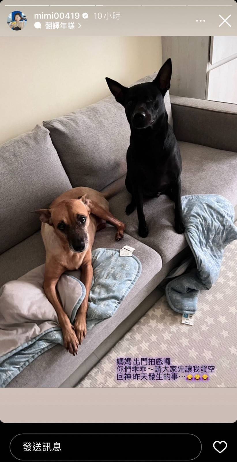 不過由于工作滿檔,米可白並未沉浸在得獎的喜悅中無法自拔,而是在隔天就立即動身上工,繼續為了自己的未來而努力,她在得獎隔天于IG現實動態上曬出了愛犬的照片,並配文對著愛犬說道:「媽媽出門拍戲囉!你們要乖乖~」