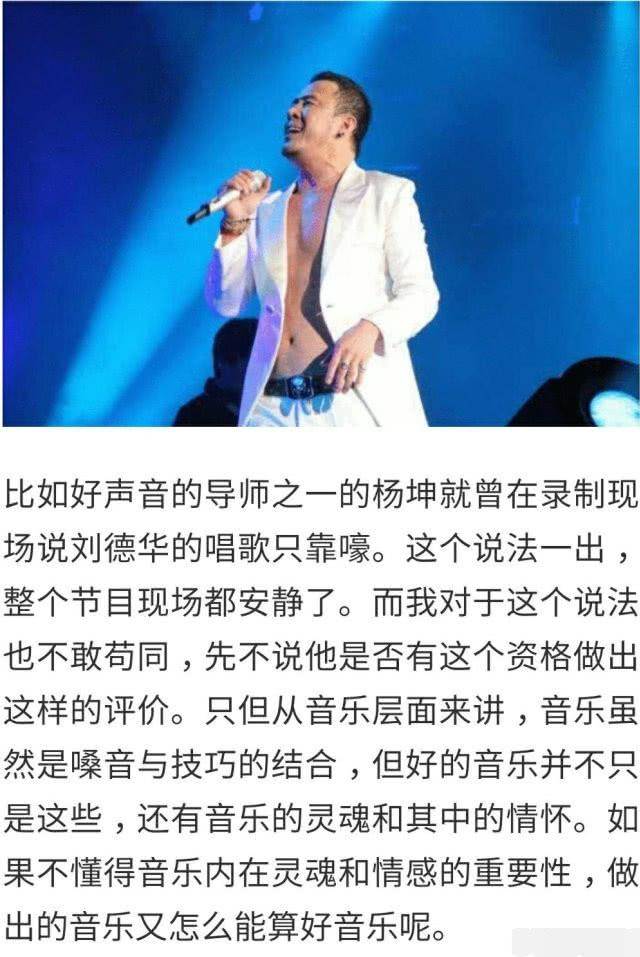 據網友爆料,楊坤在《好聲音》的錄制現場就曾評價過劉德華唱歌只靠吼。