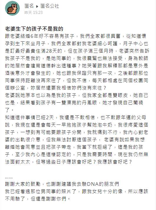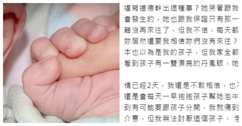 據《三立新聞》報導,這名人夫提到,自從老婆懷孕後,家人們都對她細心照顧,連月子中心也堅持住最好最貴的。女兒滿三個月時,他內心的疑惑如雪球般越滾越大,後來老婆受不了良心折磨,才對他說:「孩子不是你的,是我同事的。」兩天的時間,原PO相當糾結,不知到底怎麼處理才好?